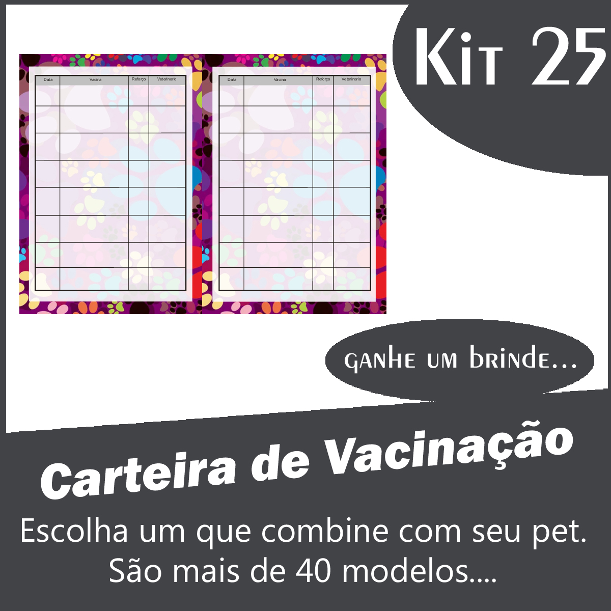 • 01 Carteira de Vacinação Personalizada: Tamanho 15cm x 21cm (fechada) frente/verso para até 16 vacinas e controle de vermifugação.